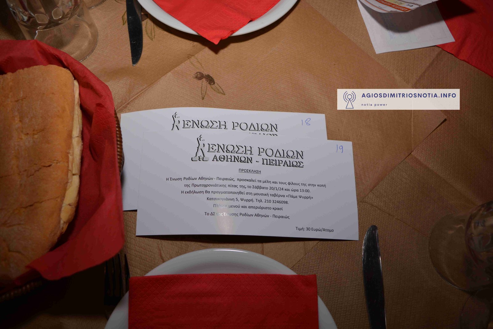 Την Πρωτοχρονιάτικη πίτα της, έκοψε η  Ένωση Ροδίων Αθηνών-Πειραιώς το Σάββατο 20 Ιανουαρίου και ώρα 13:00 στη μουσική ταβέρνα «Πάμε Ψυρρή (Το Ρεμπετάδικο του Κορρέ)».