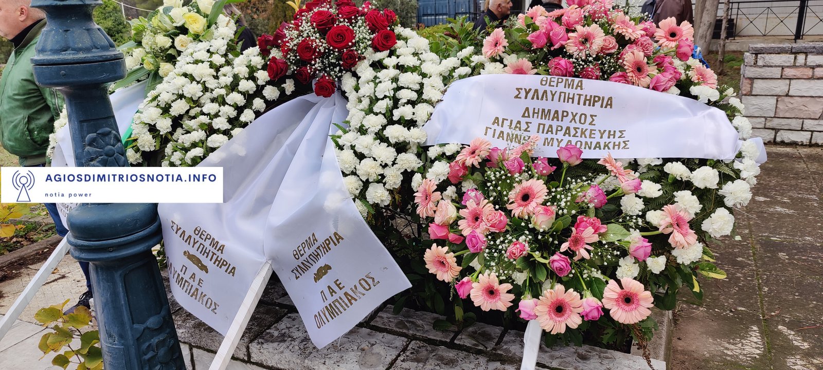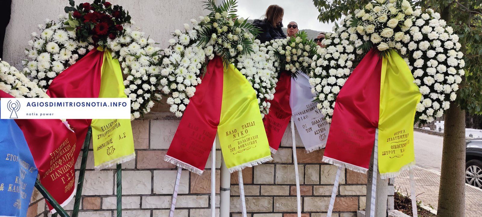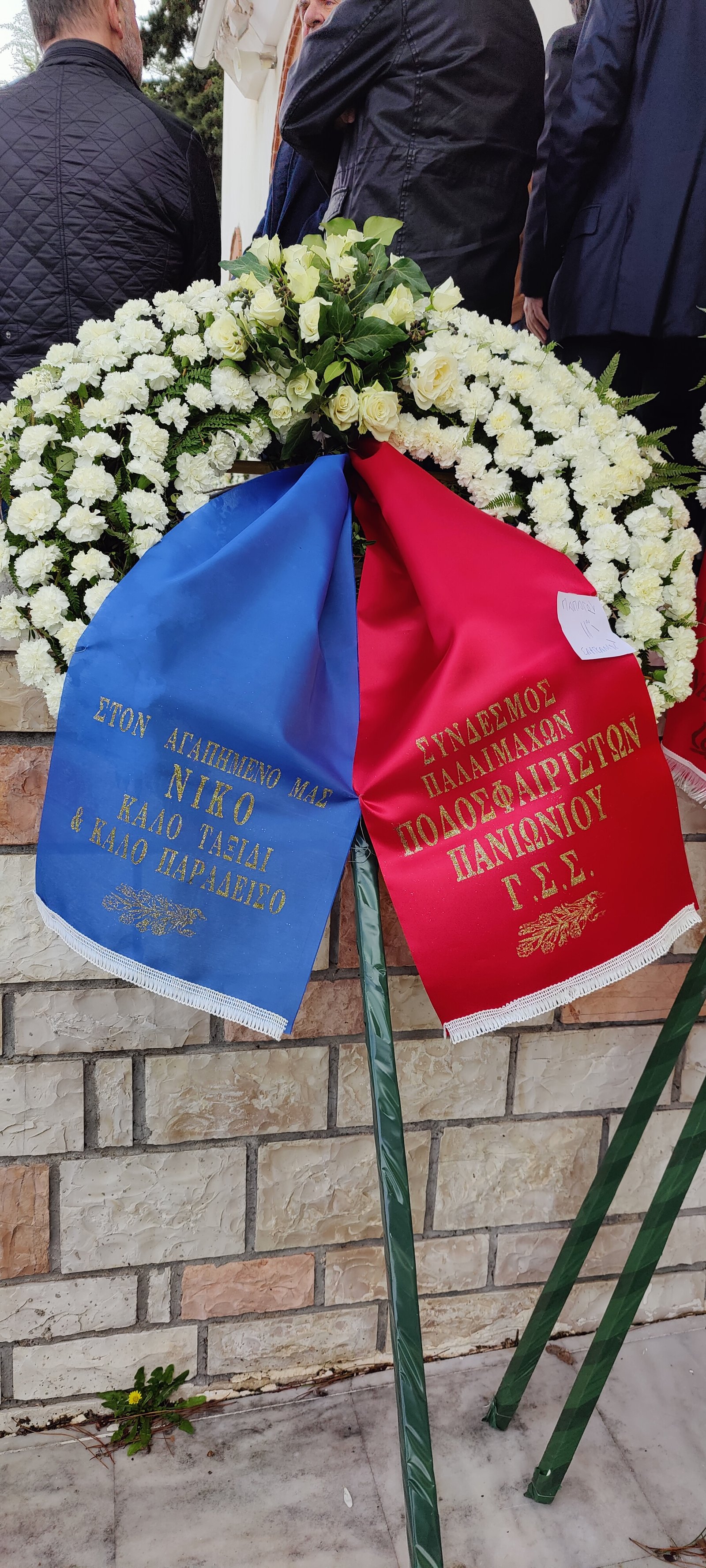 Δεκάδες ήταν τα στεφάνια, μεταξύ των οποίων εκείνα των ΠΑΕ Ολυμπιακός και Παναθηναϊκός, της ΚΑΕ Παναθηναϊκός, του Βαγγέλη Μαρινάκη, του Ιβάν Σαββίδη και των συμπαικτών του στην Καστοριά.