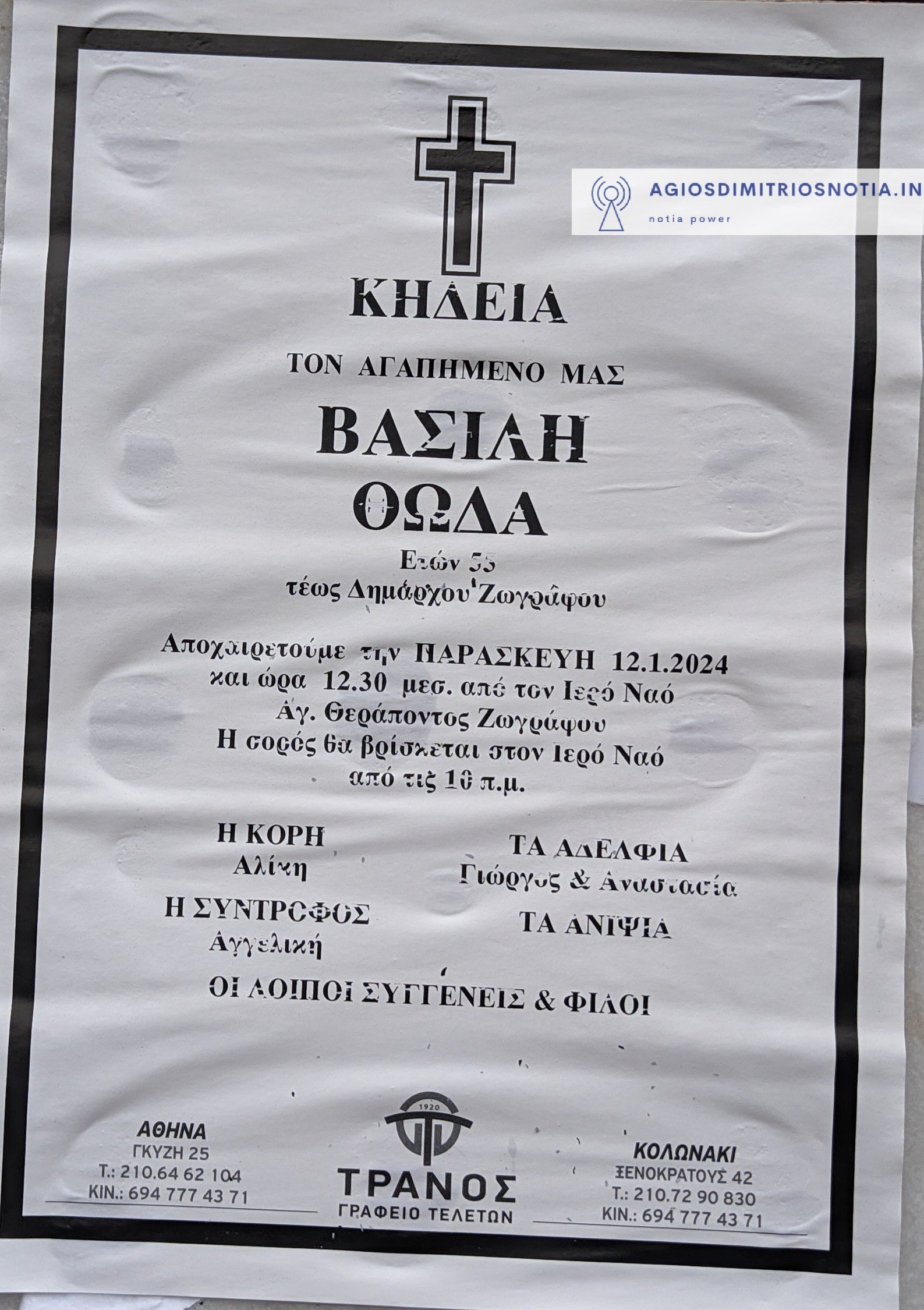 Σε κλίμα βαθιάς συγκίνησης πραγματοποιήθηκε η εξόδιος ακολουθία για τον τέως δημάρχο Ζωγράφου, Βασίλη Θώδα, στο Κοιμητήριο Ζωγράφου, που έφυγε από τη ζωή μόλις στα 56 του χρόνια από ανακοπή καρδιάς.